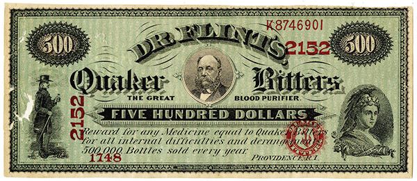 Providence, RI. $500 "Reward for any Medicine equal to Quaker Bitters, Ad note, Black on green underprint, Attractive note wit 2 small faults on the left border, back green but thins due to previous mounting removal. Fine to VF.
