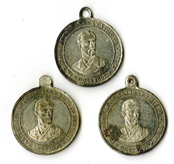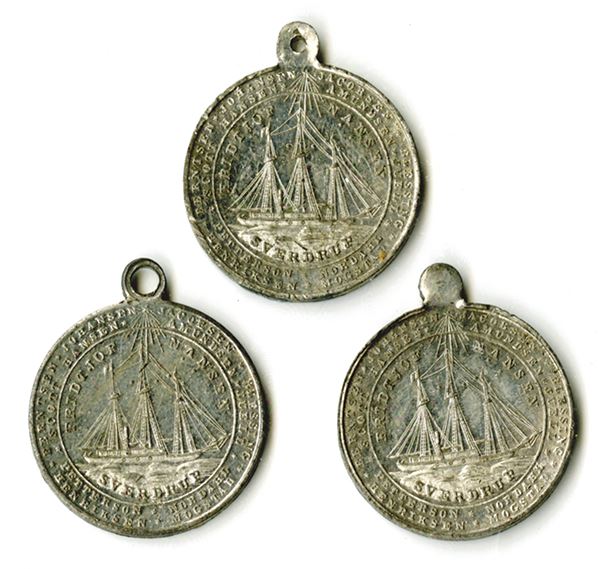 Nansen bust on obverse, R.L. below. Steam sail ship on reverse. 26mm. 2 pierced, one not. Very Fine or better, two with tin pest evident. 3 pieces.