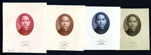 China, ND (ca.1920-30's), Lot of 4 different color portraits of SYS in brown, red, blue and gray-green, all are printed on india paper that is unmounted, All are around 3.5 by 4 inches in dimensions, Imprint on bottom of proof is “Dr.Sun Yat Sen - The Central Bank of China - Special C486 V 42488 American Bank Note Company”. Condition varies from Choice to Gem Uncirculated, but one has a small thin far from vignette. Rare vignettes from Robert Savage of SYS. Only 2 sets known of all 4 of these colors. ABNC.