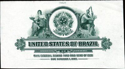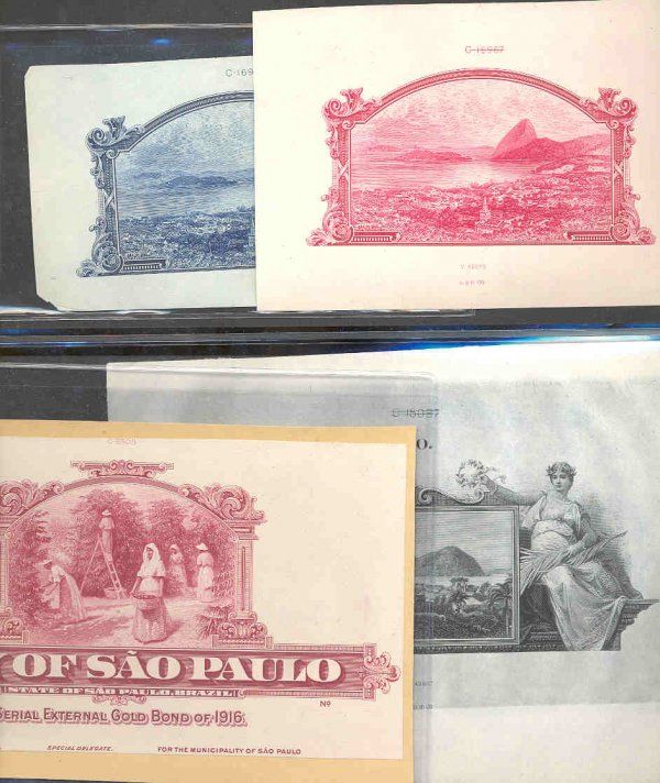 Brazil. ca.1900-1950. 8 different proofs used on stocks and bonds. 5 are printed on india paper only and 3 are printed on india paper mounted on manila card or manila archival envelope. All are in XF to choice uncirculated condition. Titles include "United States of Brazil" (2); "City of Sao Paulo"; "Republica Dos Estados Unidos Do Brazil" and others. ABNC.