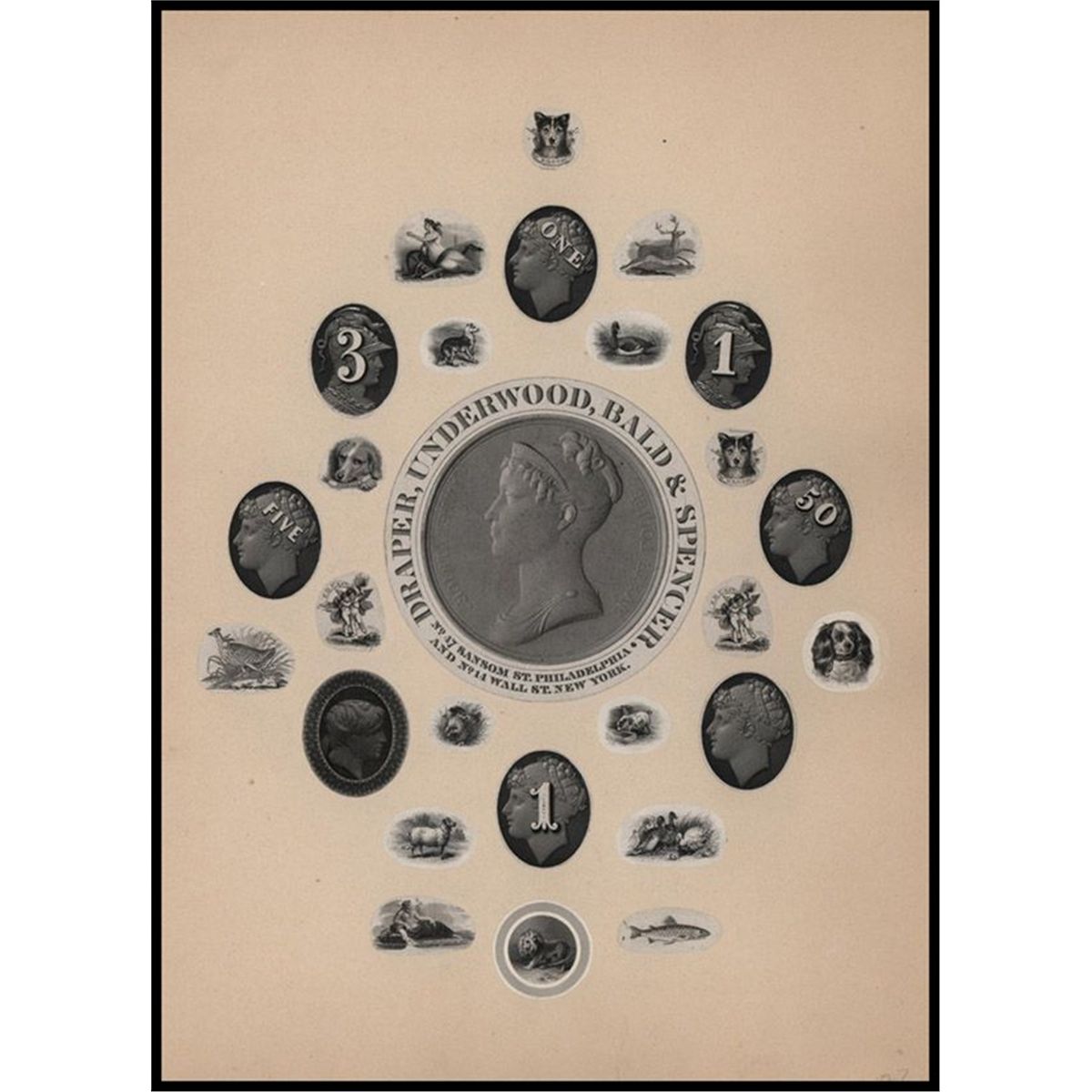 New York & Philadelphia, ND (ca. 1830-50's), Hand Made Vignette sheet for DUBS with 27 proof vignettes placed in an artistic fashion around a large central cameo vignette of allegorical woman with Draper, Underwood, Bald & Spencer - No.47 Sansom St., Philadelphia and No.14 Wall St., New York printed around it, 9 by 12 inches, 8 of the portraits are cameos with different denominations and the balance are small vignette of different animals. This was evidently prepared by one of the engravers at DUBS for their records. Unique and historic engraving record from this prestigious banknote engraver and ABNC predecessor company. DUBS. This is in of 16 different pages being offered in auction from this amazing artistic engraving record. (Portion of Lot 1846, Criswell/Stanley Gibbons Part IV, April 19-21, 1982, NASCA Sale)