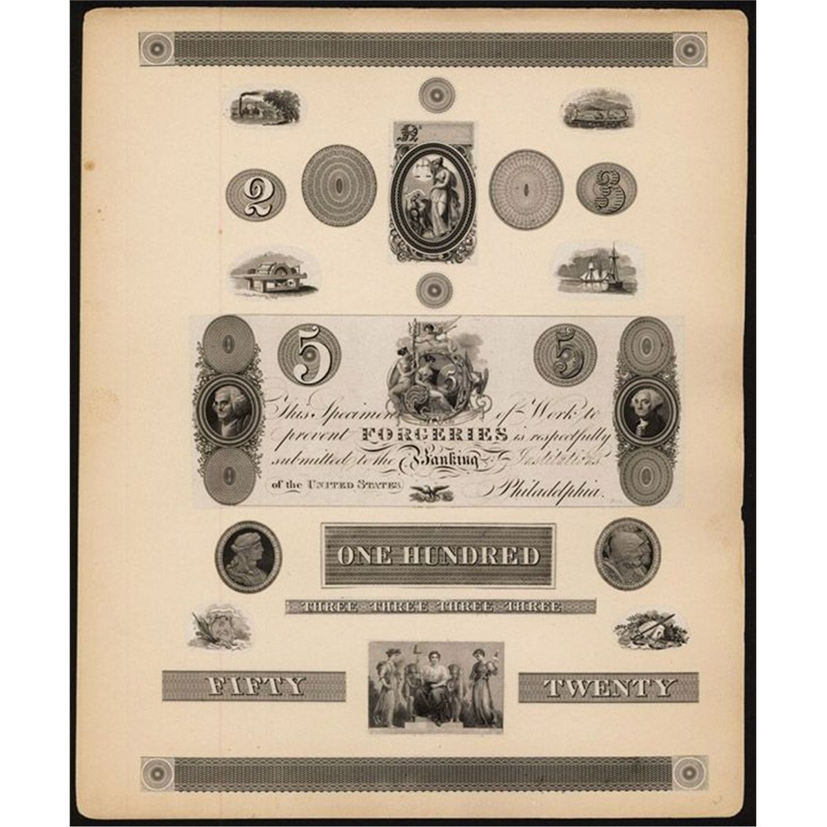 New York & Philadelphia, ND (ca. 1830-50's), Hand Made Vignette sheet for DUBS with 22 proof vignettes and one Advertising banknote placed in an artistic fashion. The advertising note has the “5” denomination with Washington and Penn on the left and right and allegorical women, cherub and eagle with the numeral 5, The vignettes include counters, cycloid engraving, cameos and numerous with other vignettes, This was evidently prepared by one of the engravers at DUBS for their records. Unique and historic engraving record from this prestigious banknote engraver and ABNC predecessor company. DUBS. This is in of 16 different pages being offered in auction from this amazing artistic engraving record. (Portion of Lot 1846, Criswell/Stanley Gibbons Part IV, April 19-21, 1982, NASCA Sale)