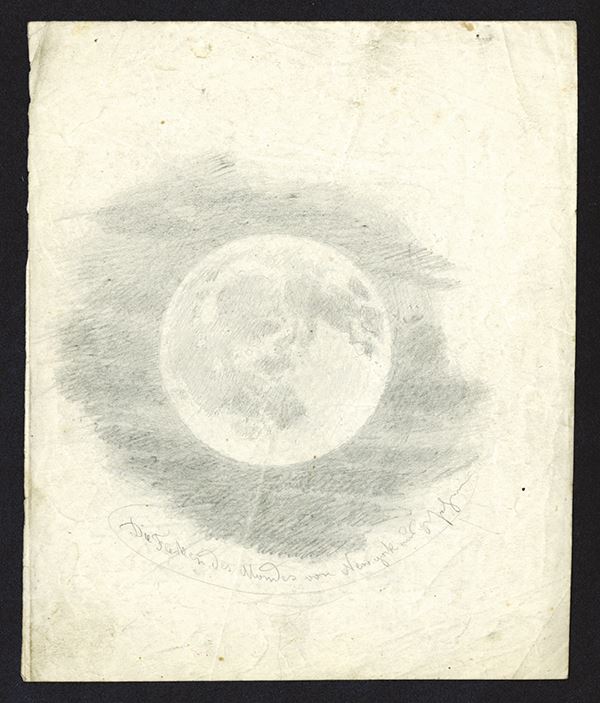 Pencil drawing of full moon, with shading. With notation in German translated loosely to Full Moon in New York.