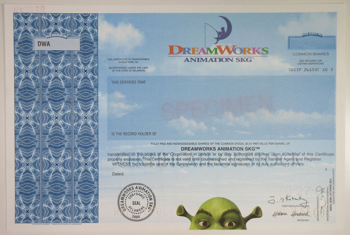 Delaware. Odd Shares Specimen Stock Certificate, Black text on cloudy sky background with Shrek looking out at bottom center, Logo at top, POC's, XF-VF condition. Popular and attractive specimen from this famous animation company. DreamWorks is an American animation studio that is a subsidiary of Universal Pictures, a division of NBCUniversal, which is owned by Comcast. Originally formed under the banner of DreamWorks Pictures in 1994 by some of Amblin Entertainment's former animation branch Amblimation alumni, it was spun off into a separate public company in 2004. DreamWorks remains one of the most successful and well-known animation companies. SC-USBN.