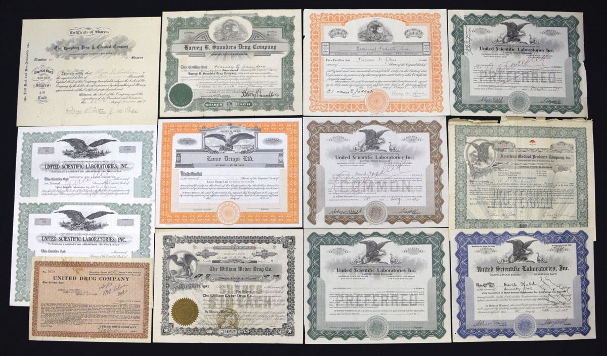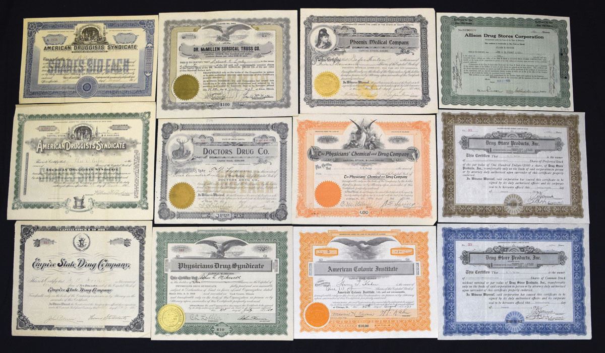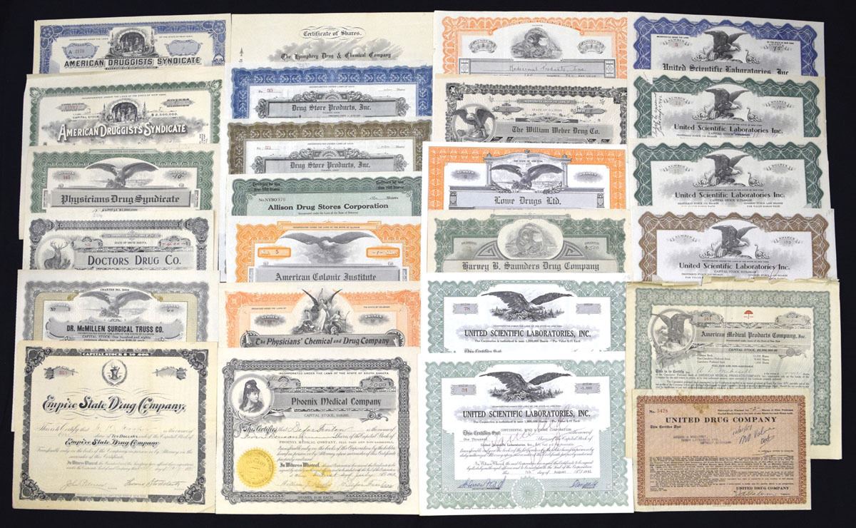 Various States...., ca. 1890-1950s. Lot of 25 I/U Stock Certificates representing pharmacies, medical supply firms, drug syndicates, and laboratories. Highlights include: American Druggists Syndicate; Doctors Drug Co.; Physicians’ Chemical & Drug Co.; United Scientific Laboratories, Inc.; United Drug Co.; and Empire State Drug Co. Certificates feature a variety of border colors and designs with eagle, allegorical, and medical-themed vignettes. Most with embossed or gold seals, punch and ink cancellations, and expected folds or handling wear. Condition generally VF to XF. (25). Sold "AS IS" no returns accepted.