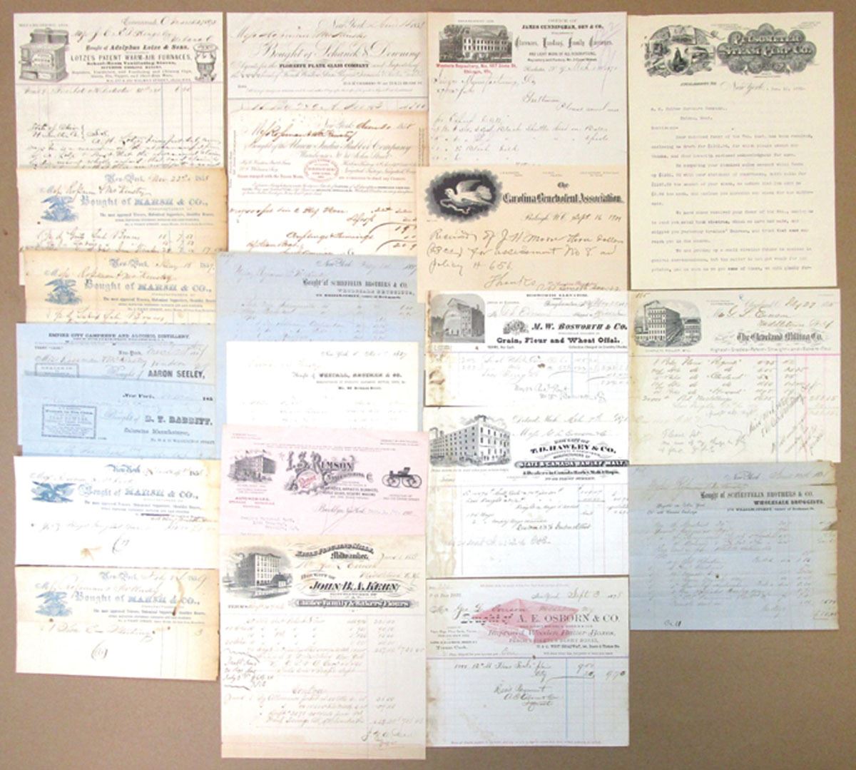 Various States, mainly north east, ca.1850s-1900s. Lot of 20+ mostly illustrated letterheads from various companies, Includes: Lotze's Patent Warm-Air Furnaces; Marsh & Co.; Aaron Seely, Camphene, Alcohol and Turpentine Distiller; B. T. Babbit, Saleratus Manufacturer; Schieffelin Brothers & Co. Wholesale Druggists; I. S. Remson Manufacturing Co. and more. (21). Sold "AS IS" no returns accepted.
