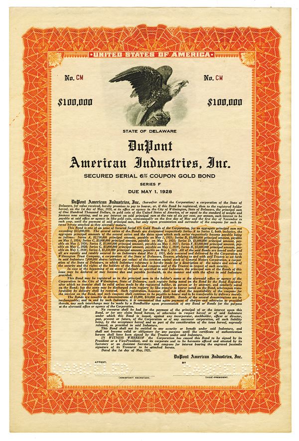 Delaware, 1921, Specimen $100,000. 6% Secured Serial Coupon Gold Bond, Series F. Orange border w/ eagle vignette. Perfin canceled. , XF. In 1914, Pierre S. du Pont invested in the fledgling automobile industry, buying stock of General Motors (GM). The following year he was invited to sit on GM's board of directors and would eventually be appointed the company's chairman. In 1921, the "DuPont American Industries, Inc. was formed to financially help GM out of difficult financial conditions by issuing bonds collateralized by the 7 Million shares of GM stock DuPont owned. In 1920, Pierre S. du Pont was elected president of General Motors. Under du Pont's guidance, GM became the number one automobile company in the world. This bond represent DuPont's financed purchase of 7 Million shares of stock. Rare bond with only 2 found in the archive.