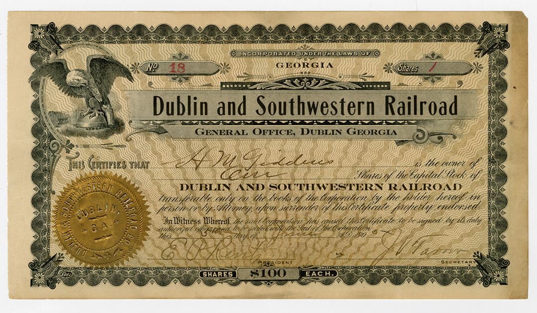 Dublin, Georgia. 1 Share I/U Capital Stock Certificate, Black print on black border with gold under tint on small sized certificate, Low serial number; #18, Bald Eagle at top right corner, VF-XF condition. Goes. Rare Georgia Railroad. Listed in Cox, no other varieties or bonds exist for this railroad. Scarce and underpriced in Cox. First time see by us.