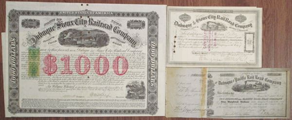 Iowa. Lot of 3 pieces: Includes Dubuque and Sioux City Railroad Co., 1879, 100 Shares I/C Capital Stock Certificate, Black text with black border, Train passing along tracks at top center, POCs, Cancelled stamp across certificate, Fine condition, and 1867, $1000 I/C 7% Sinking Fund Convertible Coupon Bond, Black text with black border and red underprint, VF condition with 3 imprinted revenues, 5 Cents and 50 Cents Green with Lincoln over $1 orange; and Dubuque and Pacific Rail Road Co., 1858, 1 Share I/C Capital Stock Certificate #68, Black text with black border, train passing by men boating at top center, POCs, Fine condition.