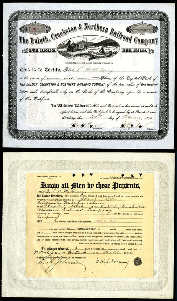 Minnesota. 1896, 1 I/C Stock, #30, Black print with ornate black border, Vignette top center of Native American canoeing up to moving locomotive, POC's, VF-XF condition. Unlisted railroad in Cox.