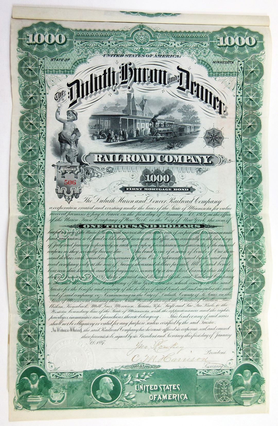 Minnesota, 1887. $1000 I/U 6% First Mortgage Bond #506, Black text with green border and undertint, Train approaching busy platform station at top center with allegorical cherub at left. Fine-VF condition, HLBN. Extremely Attractive bond.