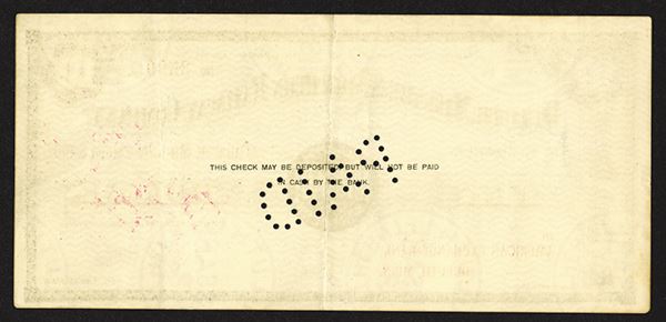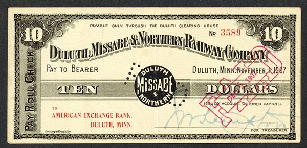 Duluth, Minnesota. 1907. P-Unlisted. $10. Issued and cancelled 1907 railroad depression scrip. Railroad logo in middle. Payable Only Through the Duluth Clearing House. VF-XF condition. Printed by Christie Lithograph & Printing Co., Duluth. Rare railroad 1907 panic or depression scrip.