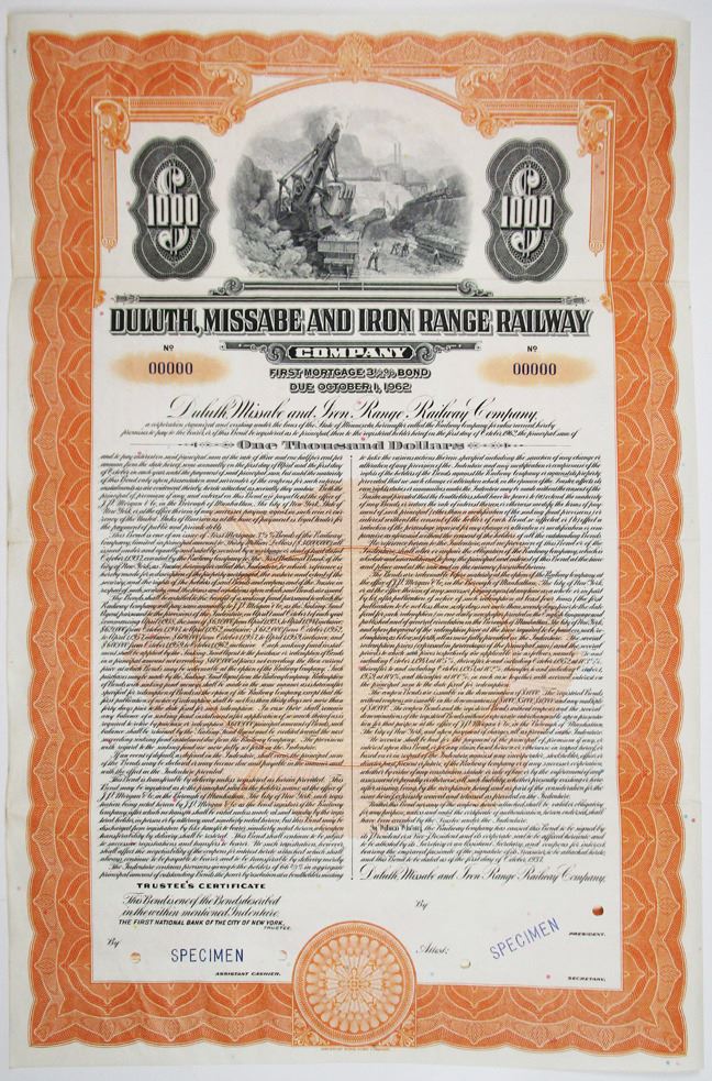 Minnesota, 1937. $1000 Specimen 3.5% First Mortgage Coupon Bond, Black text with orange border and undertint, Men at work in large quarry at top center. Blue specimen overprints, 00000 serial numbers, and POCs. VF condition, ABNC. Unlisted color, Rare specimen in Cox.