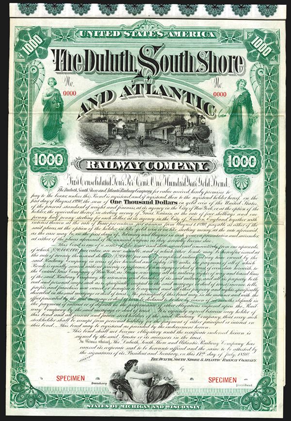Wisconsin and Michigan, 1890, $1000, Specimen, 1st Consolidated 4% Gold bond. Black with green border and underprint, Allegorical Reaper and Justice flank locomotives under bridge with title on top and reclining woman with book and lamp on bottom, VF+ to XF condition. Red specimen overprints, POC's and "00000" serial numbers. Coupons attached. Rare certificate. ABNC. Only known as specimen.