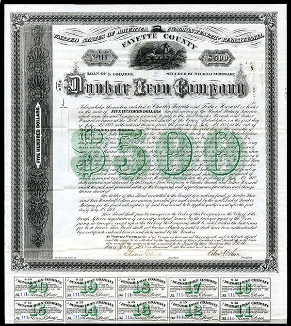 Pennsylvania. 1872. $500 6% I/U Bond with 19 coupons attached. #111. Black print with green underprint. Man pushing ore cart top center. VF condition. Otto Krebs Lith.
