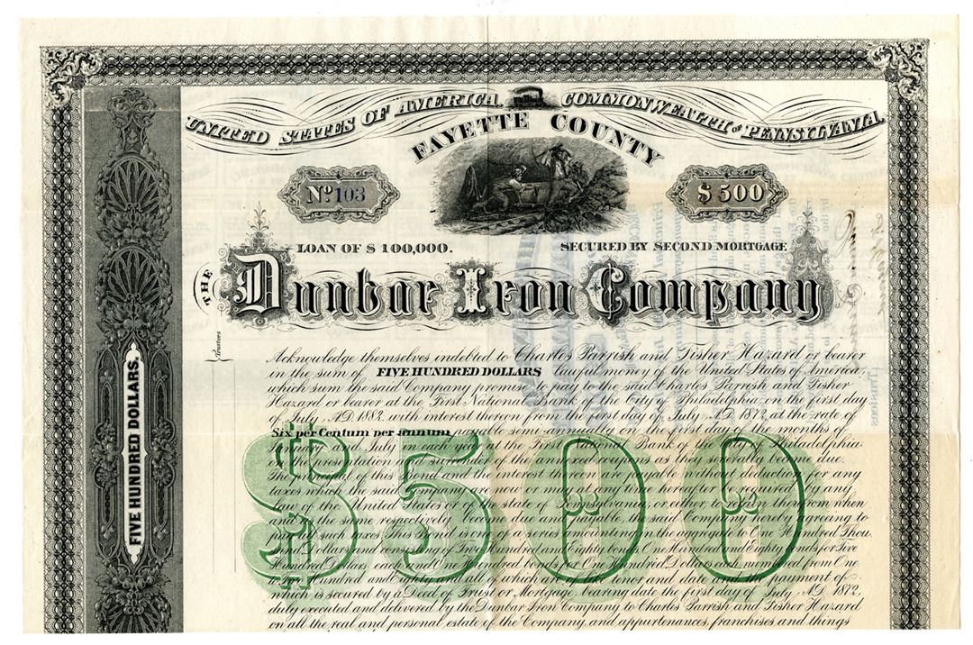 Pennsylvania, 1872. $500 I/U 6% Second Mortgage Coupon Bond, S/N 103, Black text with black border and green underprint, Men at work in mine at top center. VF condition.