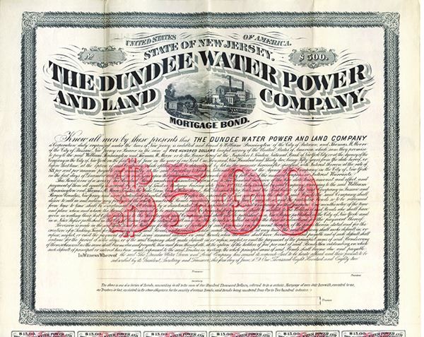 New Jersey, 1882. $500 Specimen 6% Mortgage Coupon Bond, Black text with black border and red underprint, Train passing by utilities building at top center. POCs, Return to Issue Room stamp at back. VF condition with some adhesive marks at back of coupons. HLBN. The Dundee Manufacturing Company (DMC), incorporated 1832, built the Dundee Dam across the Passaic River c. 1833, replacing an earlier wing dam it had built c. 1830. The DMC, which had reorganized in 1850, built the Dundee Canal between 1858 and 1861. This canal was not financially successful for navigation, and the company went into receivership in 1864. It reorganized as the Dundee Water Power and Land Company (DWPLC) in 1872, and the company's new emphasis on supplying water and selling land was more lucrative. The Dundee Canal Industrial Historic District was added to the National Register of Historic Places on January 21, 1999. Rare Homer-Lee Specimen Bond.