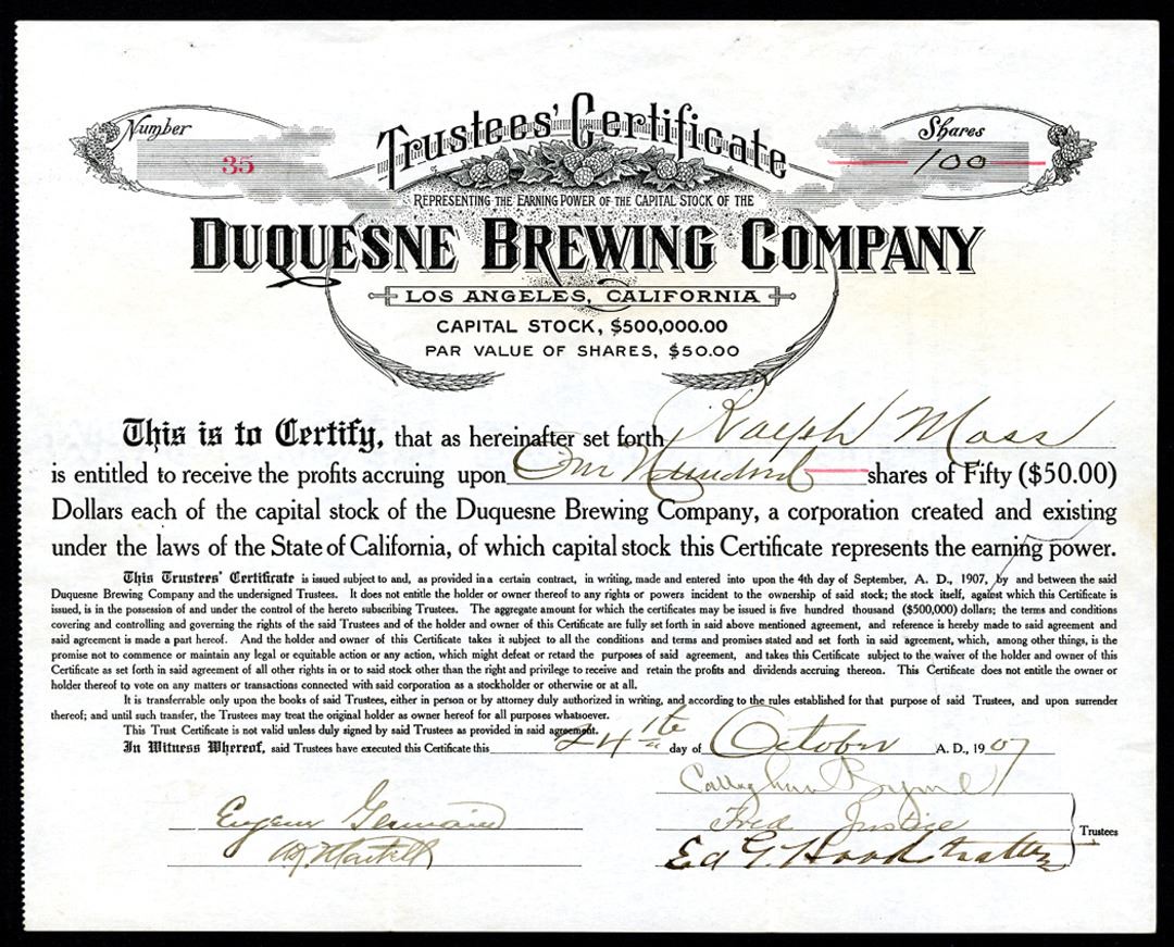 Los Angeles, California, 1907, I/U Stock, 100 Shares, #35, Black print with no border or vignette, VF condition. Duquesne Brewing Co. opened in 1908 and closed in 1909 it was open for 1 years. Since it was only open for a short period of time items for this brewery can be accurately dated and are likely to be rarer than normal As a Pre-Prohibition Brewery, any advertising items or collectibles are likely to be valuable and desirable to collectors as they tend to be hard to find. Duquesne Brewing Co. was in an active brewing city. Los Angeles, CA was listed as having 35 breweries, which is quite a few. Sometimes a large number of breweries can lead to an active collecting community that will be willing to pay more for breweriana items than other collectors.