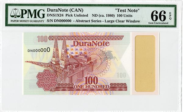 Canada and U.S., DuraNote Polymer, Banknote Predecessor, Advertising Note Specimen. ND, ca.1980-90's, 100 Units "Test Note", S/N DN000000, PMG designation DNS1X24, P-Unlisted, oil platform on front and back with oil wagon being pulled by horses, Large clear translucent Gold window design security element on the right counterfoil excess margin. This note was part of a project from Mobil Oil for testing petroleum based hydrocarbon polymer paper for printing banknotes. PMG graded Gem Uncirculated 66 EPQ condition. Scarce and attractive.