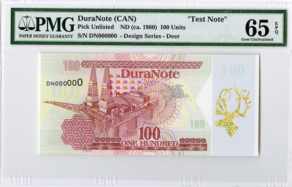 Canada and U.S., DuraNote Polymer, Banknote Predecessor, Advertising Note Specimen. ND, ca.1980-90's, 100 Units "Test Note", S/N DN000000, P-Unlisted, oil platform on front and back with oil wagon being pulled by horses, Gold foil elk or deer design security element on the right counterfoil excess margin. This note was part of a project from Mobil Oil for testing petroleum based hydrocarbon polymer paper for printing banknotes. PMG graded Gem Uncirculated 65 EPQ condition. Scarce and attractive.
