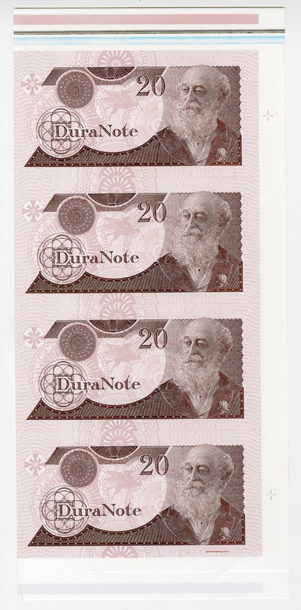 New York and Canada, uncut strip of 4 notes, all with Charles Darwin "20 denomination" design on face, small Pegasus on underprint, no S/N's, back with undertint only. Large excess margin in white at right. Choice to Gem Uncirculated. Rare DuraNote polymer paper sample.