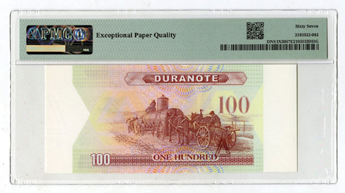 Canada, and U.S., DuraNote Polymer Banknote Predecessor, Advertising Note Specimen. ND, ca.1980-90's, 100 Units "Test Note", No Serial Number, P-Unlisted, oil platform on front and back with oil wagon being pulled by horses, Double Triangle Right & Lower left security design element. This note was part of a project from Mobil Oil for testing petroleum based hydrocarbon polymer paper for printing banknotes. PMG graded Superb Gem Uncirculated 67 EPQ condition. Scarce and attractive.