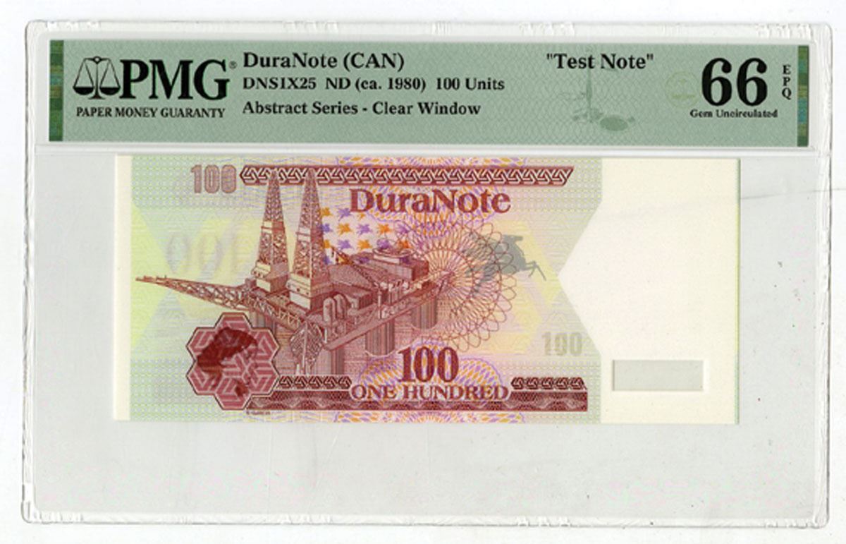 Canada, and U.S., DuraNote Polymer Banknote Predecessor, Advertising Note Specimen. ND, ca.1980-90's, 100 Units "Test Note", No Serial Number, P-Unlisted, oil platform on front and back with oil wagon being pulled by horses, "Abstract Series - Clear Window right and Young woman left" security design element. This note was part of a project from Mobil Oil for testing petroleum based hydrocarbon polymer paper for printing banknotes. PMG graded Gem Uncirculated 66 EPQ condition. Scarce and attractive.