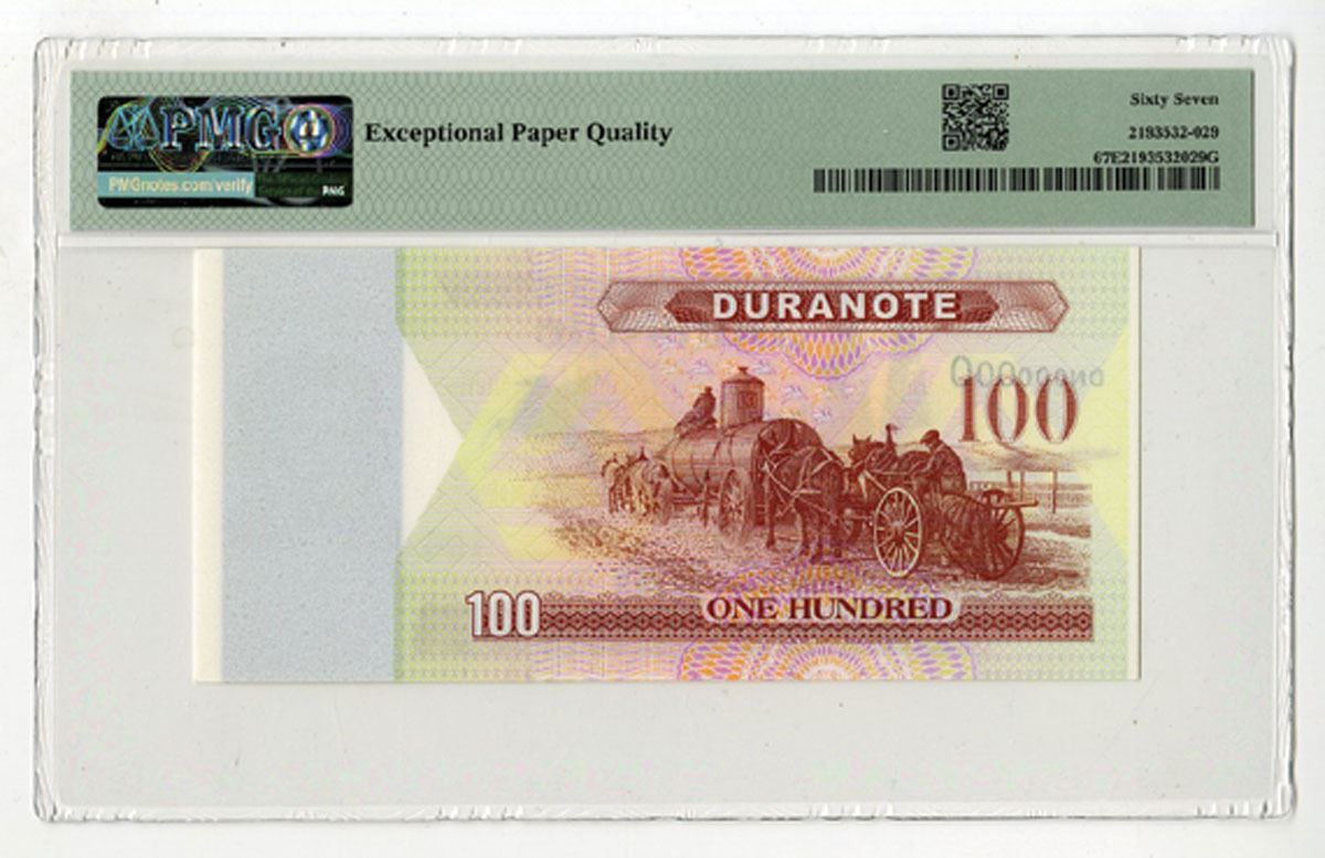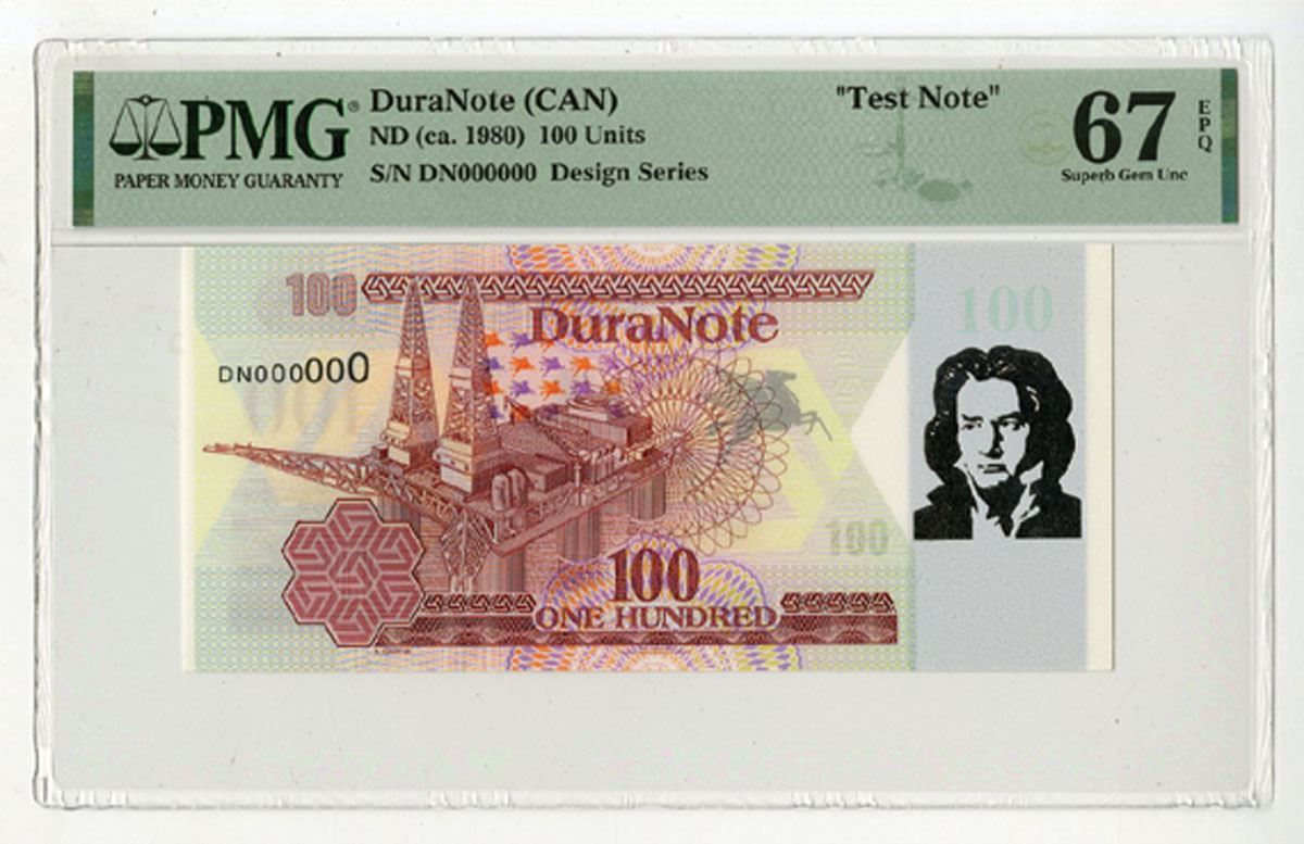 Canada, ND (ca.1980). 100 Units Dura Note, Red brown and m/c underprint with oil rig at center and small silver Pegasus with Beethoven at right, PMG graded Superb Gem Uncirculated 67 EPQ.