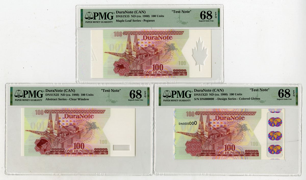 Canada & U.S., , ND (ca.1980). Lot of 3 DuraNote Polymer Test Notes with different designs and security features, Includes: DNS1X23 with Colored Globes, DNS1X15 with Maple Leaf and Pegasus, and DNS1X25 from Abstract Series with Clear Window. All notes are PMG graded Superb Gem Uncirculated 68 EPQ. (3). Sold "AS IS" no returns accepted.
