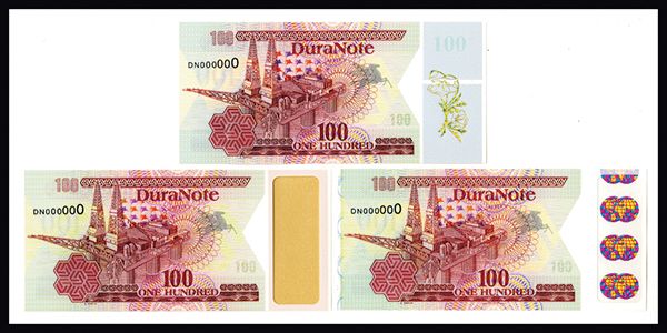 ND, ca.1980-90's, Lot of 3 polymer sample notes with different security elements added. All are 100 Denomination notes with oil platform on front and back with oil wagon being pulled by horses, Includes security elements colorful globes in clear window, clear window and gold ornate design, all on the counterfoil excess margins, these notes were part of a project from Mobil Oil for testing petroleum based hydrocarbon polymer paper for printing banknotes. All are in Choice to Gem Uncirculated condition. Scarce and attractive.