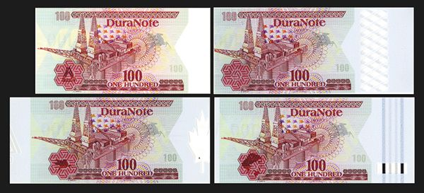 ND, ca.1980-90's, Lot of 4 polymer sample notes with different security elements added. All are 100 Denomination notes with oil platform on front and back with oil wagon being pulled by horses, Includes security elements Maple Leaf, Vertical black stripes with clear window, Triangle with 100 denomination and diagonal lines, all on the counterfoil excess margins, this was a project from Mobil Oil testing hydrocarbon polymer paper for printing banknotes. All are in Choice to Gem Uncirculated condition. Scarce and attractive.