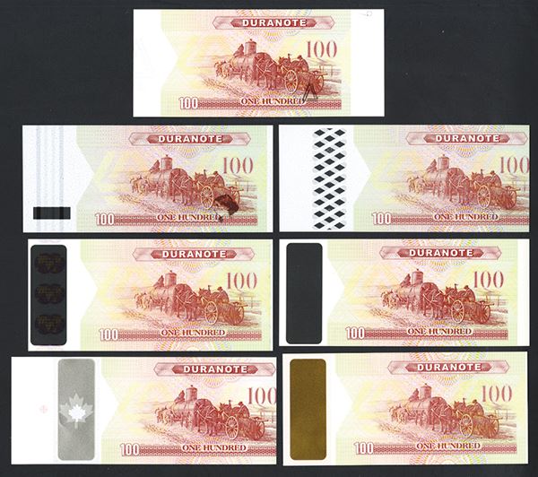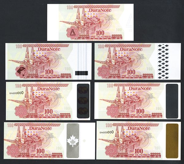 ND, ca.1980-90's, Lot of 7 different polymer sample notes with different security elements added. All are 100 Denomination notes with oil platform on front and back with oil wagon being pulled by horses, Includes security elements with colorful and ornate designs, all with variations of vertical striped bars on right with various security features on the counterfoil margins. The notes were part of a project from Mobil Oil for testing petroleum based hydrocarbon polymer paper for printing banknotes. All are in Choice to Gem Uncirculated condition. Scarce and attractive.