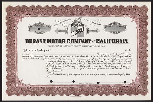 California, 1921, Odd shs., Specimen Stk. certificate, Brown border with Company logo vignette, POC's, HBNC., XF to Uncirculated condition, XF condition, Rare and early automobile variety that is possibly unique.