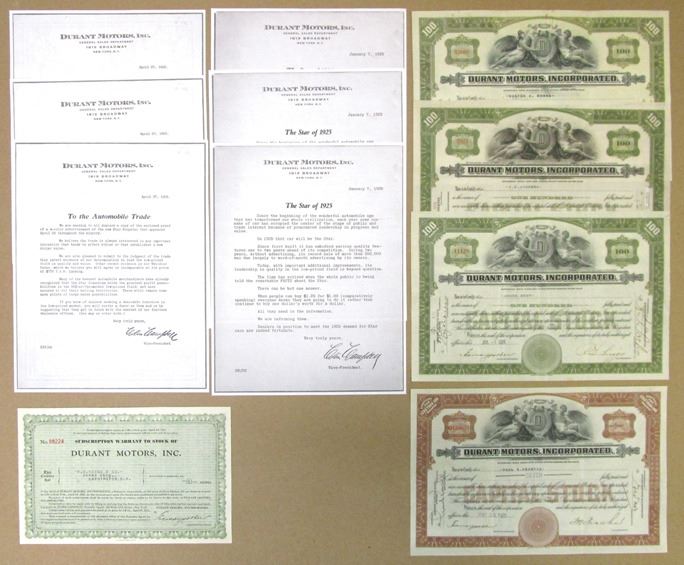 Delaware...., 1922-31. Lot of 5 I/U Certificates, Includes: Capital Stock Certs. And Warrant Subscriptions. Lot also includes additional historical information Durant Motors distributed to their dealerships nationwide. Documents range from VF to XF condition. (11). Sold "AS IS" no returns accepted. (ex. John E. Herzog Collection)
