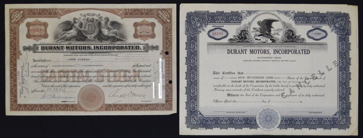 Delaware, 1922. Lot of 2 Stock Certificates for Varying Shares, One is an I/U in brown and black by ABNC, and the second is a remainder in I/C condition Both are large-format capital stock certificates with distinctive border styles. Conditions range from F-VF to VF, with folds, handling, and light edge wear typical of period-issued material. (2). Sold ‘AS IS’ no returns accepted.