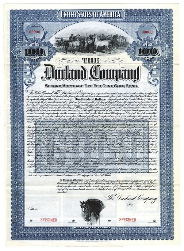New Jersey. $100 Specimen 5% 2nd Mortgage Gold Coupon Bond, Black print on blue border and under tint, Men with horses at top, Specimen overprints and POC's, Fine condition with splitting along fold lines condition, ABNC.