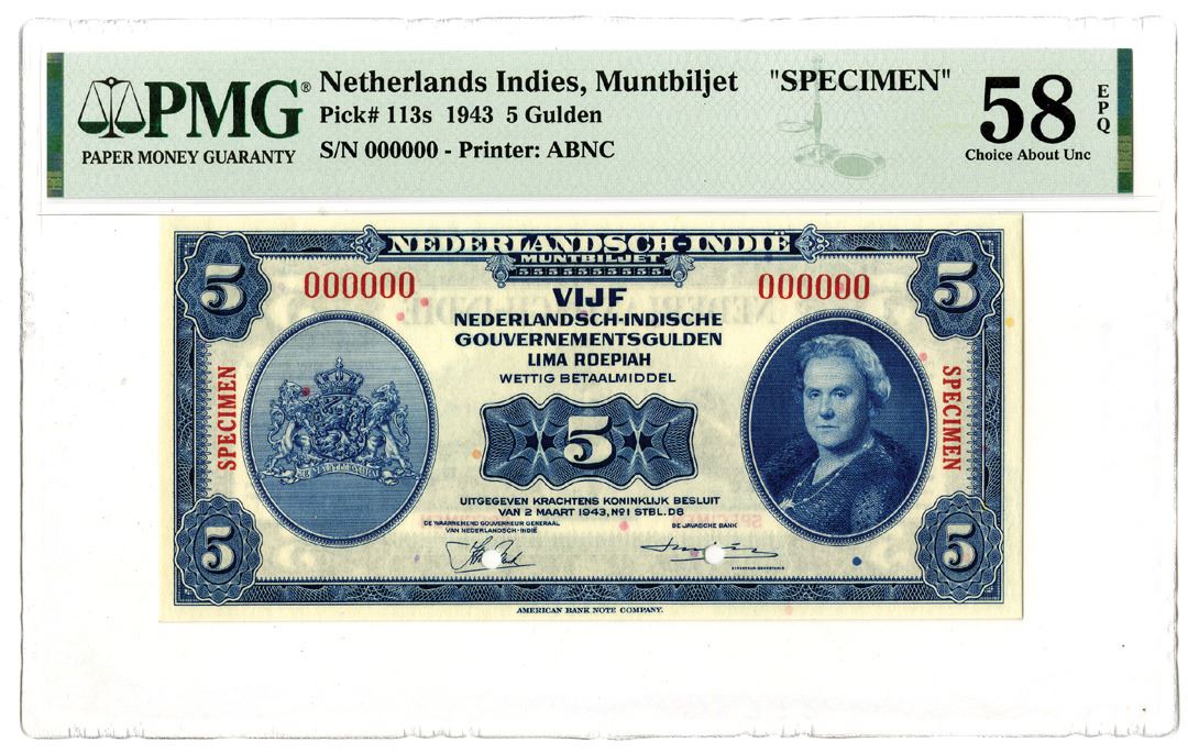 Netherlands IndiesÉ.. 1943. 5 Gulden, P-113s, specimen banknote, serial 000000, overprinted "SPECIMEN", POCs, PMG graded Choice About Uncirculated 58 EPQ, ABNC. (From the Allen Berk Collection)