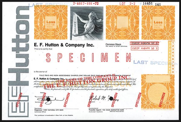 Delaware, 1972-1980, <100 Shares, black on orange-yellow, Woman with her hands below and above the company's name top center, Overprinted in red "E.F.Hutton Group Inc.", POC's, VF-XF condition, ABNC.