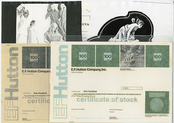 New York. Mockup Proof, 100 Shares, Unissued design, Design elements pasted to thin cardboard, VF to XF condition. Also includes a photo proof of the design as well as order form from and Security-Columbian Bank Note Company production file. Unique in archives. SCBN (From the ABN Archives discovered in 2002).