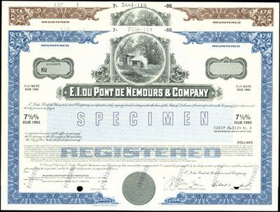 DE. 1974-1986. Specimen. 5 different registered bonds. All with vignette of house with stone wall. All are $ odd. 1) 7 1/2%, blue. 2) 8 1/2%, brown. 3) 8%, red. 4) 8 1/2%, purple. 5) 8.45% olive green. Only 2 or 3 of each variety were found in archive. Rare group of DuPont bonds. ABNC. XF.