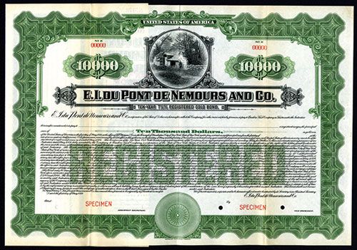 Delaware, 1921, $10000, 10 Year 7 1/2% Registered Gold Specimen Bond, Black on green border and underprint, Vignette of country house with man standing outside, POC's red SPECIMEN overprints and red s/n “00000 “, VF-XF condition, ABNC.