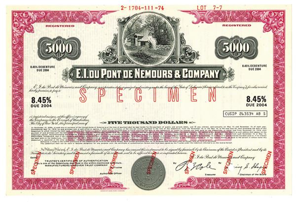 Delaware. $5000 Specimen 8.45% Registered Debenture Bond, Black print on pink/purple border and under tint, Country cottage at top, Multiple specimen overprints and POC's, VF-XF condition, ABNC.