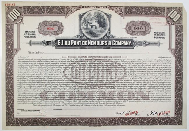 Delaware, 1915. 100 Shares Specimen Stock Certificate, Black text with purple-brown border and underprint, Man standing by stone building at top center. Red specimen overprints, Return to Specimen Dept. stamp at top right, 00000 serial numbers, and POCs. Fine to VF condition with a piece missing from top right corner away from design, ABNC. Rare large format Common stock certificate type.