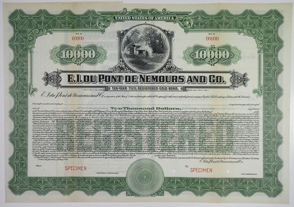 Delaware, 1921. $10,000 Specimen 7.5% Registered Gold Bond, Black text with Green border and undertint, Man reclining against stone shed at top. Red specimen overprints, 00000 serial numbers, and POCs. VF condition, ABNC. Rare specimen. Only 2 examples were found in the ABN Archives in 2002, this is the only example of this variety available.