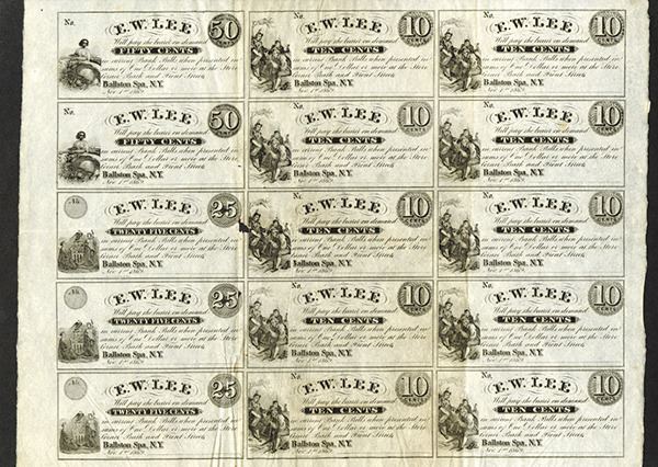 Ballston Spa, N.Y., Nov. 1st, 1862, Uncut remainder sheet of 15 notes, 5cts -50cts-25cts-25cts-25cts-10cts (10 examples). The 50 cent notes have seated allegorical Plenty with cornucopia; the 25 cent notes have allegorical women and eagle with New York arms; and the 10 cent notes have 2 men with drummer, all with no signatures or serial numbers, condition ranges from VF with small faults including small hole to AU, a few exhibit toning and light folds still attractive and rare sheet. Printed by Lewis & Goodwin, Albany.