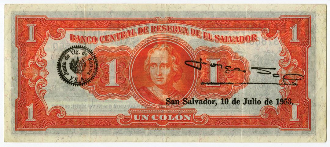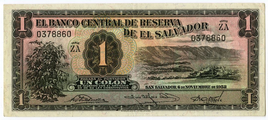 El SalvadorÉ.., 1952. 1 Colon, P-87, Issued banknote, Black on multicolor underprint, S/N 0378860, Black overprint on back with 1953 date. Printer: W&S.