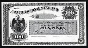 Mexico. 18xx. (ca. 1882). 100 Pesos. P-S253p. Proof banknote. Printed on india paper in black without undertint. No serial numbers. Arms of Mexico with eagle and snake on left. Note appears to be Unc. but there is an extremely light vertical fold on the left 1/4 of the note. Issued note catalogs $3,250 in good. Extremely rare in any form. ABNC.