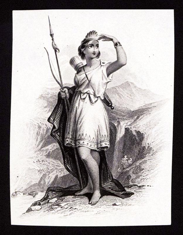 Early Banknote Printer Vignette of Native American Woman.ND (ca.1840-50's), Production department working or production proof. Portrait of young Native American woman with bow and arrows with mountain and waterfall behind her, No imprint but possibly the work of RWHE, BCC or DWC but pre ABNC formation. Early production proof printed in black on india paper for use of the production department in obsolete banknote, bond, check and fiscal document designing, Uncirculated to CU condition. The proof was for internal production use which is why it was not mounted on card. Rare Security Printing ephemera.
