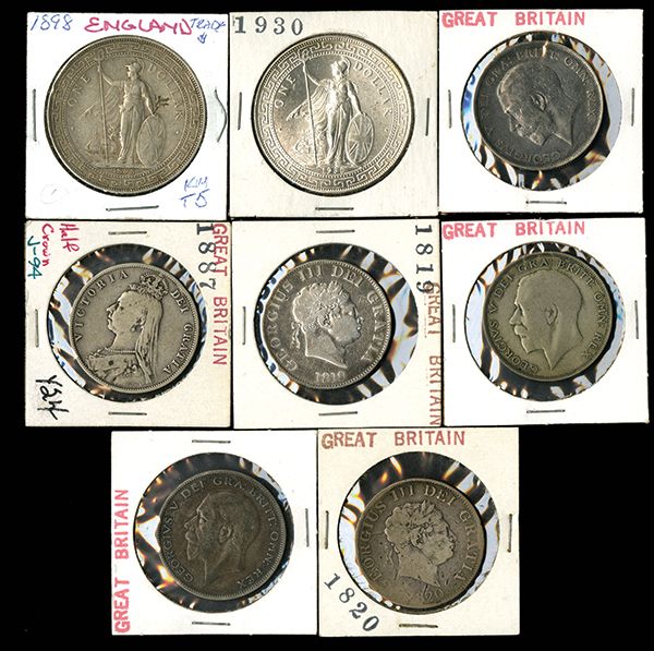 Early British Half Crowns and Trade Dollars. Five different Half Crowns 1819-1929 average Fine. Trade Dollar 1898 Fine, chop marked, 1930 Uncirculated but lightly polished. [7]