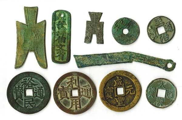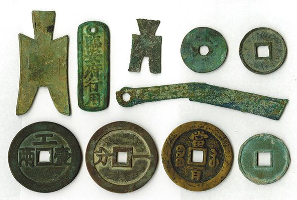 China. Examples include a Ming Knife FD341, Chau Spade (large and small, FD 127, 160), Chou round coin (FD 359, Schjoth 75), 400 Cash Merchant Tally, Ming Rebel 100 Cash (2), Sung Ta-Kuan 10 Cash, Yan Tsung 10 Cash, Hsien-Feng 100 Cash. Many with various verdigris and patina. Sold as is. 10 pieces.